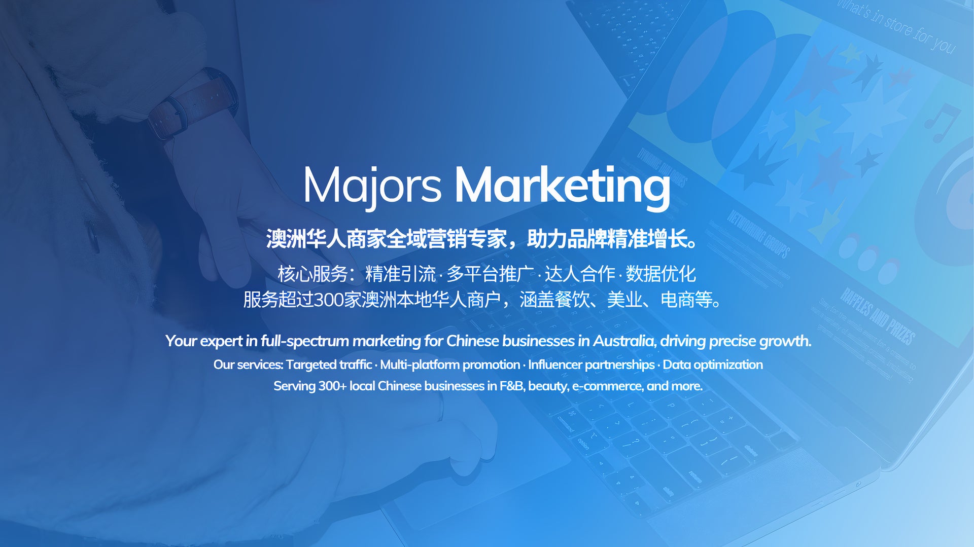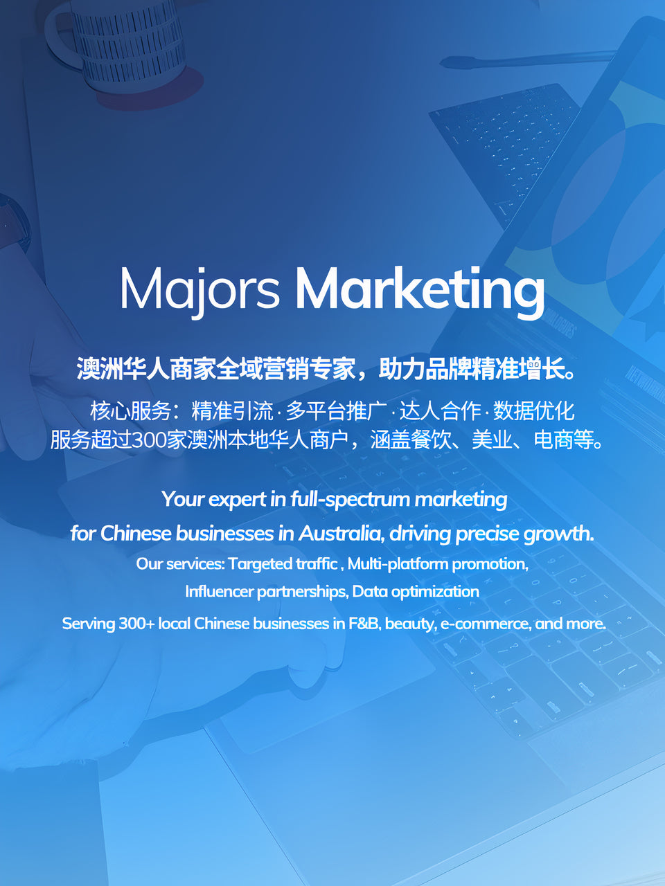 Majors Marketing 专注服务澳洲华人商家,帮你快速提升品牌曝光和粉丝互动。不论是社交媒体代运营、达人合作,还是Google优化和独立站建设,我们都帮你一站搞定,让客户“真正看见你”+“看见最好的你”。